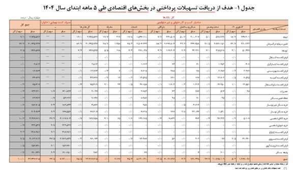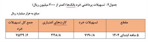 به نقل از بانک مرکزی، تسهیلات پرداختی بانکها طی ۵ ماهه ابتدای سال ۱۴۰۴ مبلغ ۳۲۳۳۷.۷ هزار میلیارد ریال میباشد که در مقایسه با دوره مشابه سال قبل مبلغ ۸۷۵۶.۶ هزار میلیارد ریال (معادل ۳۷.۱ درصد) افزایش داشته است. از کل تسهیلات پرداختی، مبلغ ۲۴۴۱۷.۷ هزار میلیارد ریال معادل ۷۵.۵ درصد به صاحبان کسب و کار (حقوقی و غیرحقوقی) و ۷۹۲۰.۰ هزار میلیارد ریال معادل ۲۴.۵ درصد به مصرفکنندگان نهایی (خانوار) تعلق گرفته است.